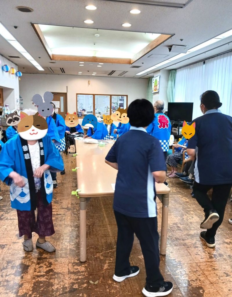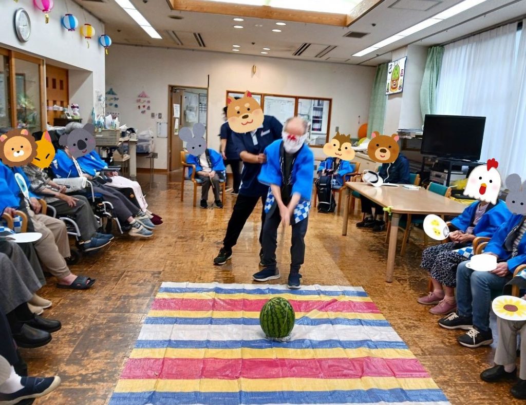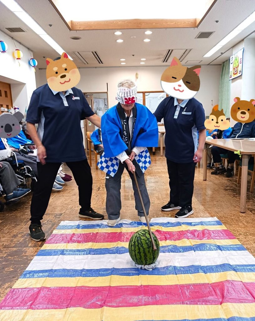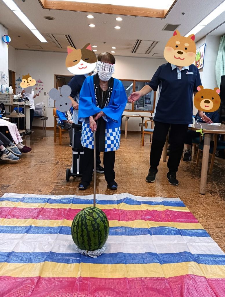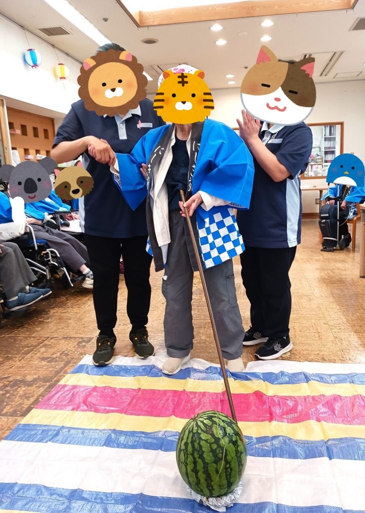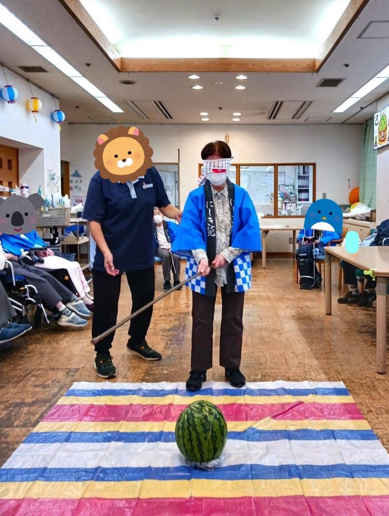 納涼祭 8月末に、にしき苑では納涼祭を行いました。 今回は8/28(木)のデイサービスのご様子です。 まずは皆さんで盆踊りを楽しみました。 盆踊りの曲が流れるだけでわくわくしますよね 次にスイカ割りを行いました。 希望者を募ってスイカ割りに挑戦です! やったー! すごいスピード! かまえがかっこいいです スイカ割りを楽しんだ後は、皆さんでスイカを堪能しました🍉 まだまだ暑い日は続きそうですが、 少しでも暑さを忘れて楽しんでいただけて良かったです。